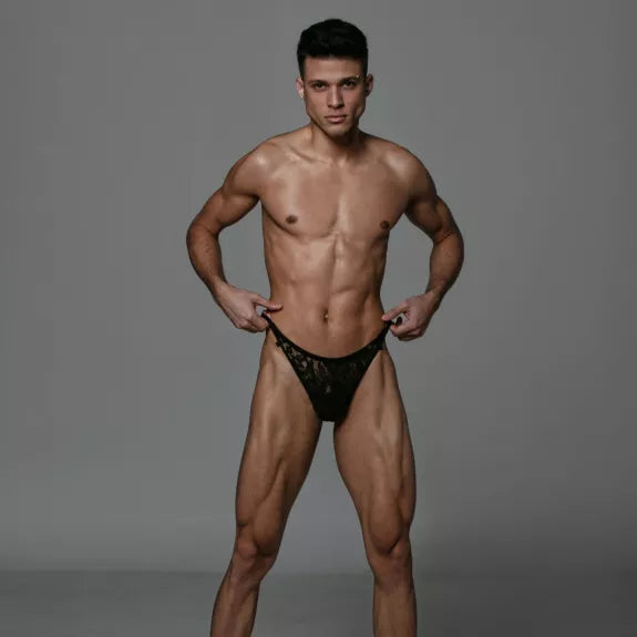 Der Lace Thong in der Farbe Black ist ein außergewöhnliches Herrenunterwäschestück, das mutig neue Maßstäbe setzt. Hergestellt aus hochwertiger, floraler Spitze, vereint dieser Low-Rise String eine transparente, raffinierte Optik mit einem provokanten Design. Dank des vollständig transparenten, hoch geschnittenen Schnitts wird Ihre Silhouette perfekt betont, während der ungefütterte Frontbeutel und das leichte, atmungsaktive Material höchsten Tragekomfort bieten. Dieses Modell richtet sich an selbstbewusste Männer, die ihre Individualität durch Ausstrahlung und Stil zum Ausdruck bringen wollen.