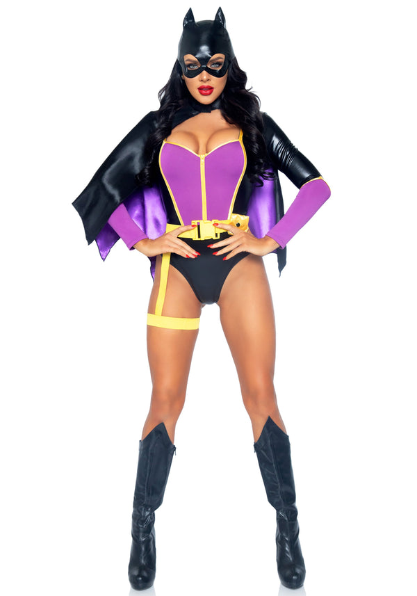 Das Bombshell Bat Damenkostüm von Leg Avenue verwandelt Sie in eine verführerische Superheldin mit einem einzigartigen Mix aus sexy Wetlook und dramatischen Details. Der langärmelige Body sitzt eng anliegend und betont durch seinen tiefen V-Reißverschluss und den Druckknopfverschluss Ihre Figur auf eine reizvolle Weise. Das kontrastierende Mieder formt eine schlanke Taille, während der angenähte Gürtel mit Strumpfband für eine zusätzliche Portion Erotik sorgt. Die Fledermausohren-Totenkopfmütze aus glänzendem Wetlook-Material verleiht dem Outfit eine freche Note und unterstreicht den dunklen Superheldinnen-Charakter. Abgerundet wird das Kostüm durch den metallisch schimmernden, bauschigen Umhang, der bei Ihren Auftritten garantiert alle Blicke auf sich zieht. Das Kostüm ist perfekt geeignet als sexy Superheldinnen Kostüm für Karneval, Fasching, Halloween oder aufregende Motto-Partys, bei denen Sie mit einem individuellen Look punkten möchten. Der hochwertige, dehnbare Wetlook-Stoff garantiert optimalen Tragekomfort und eine perfekte Passform. Die Pflegehinweise sorgen dafür, dass Ihr Kostüm lange schön bleibt und immer wieder einsatzbereit ist. Ob für Rollenspiele, erotische Events oder den nächsten Comic- und Fantasy-Abend - das Bombshell Bat Kostüm kombiniert Qualität, Stil und eine verführerische Ausstrahlung in einem einzigartigen Gesamtpaket. Entdecken Sie jetzt das perfekte Superheldinnenkostüm mit sexy Body, auffälligen Accessoires und einem dramatischen Umhang, das Ihre dunkle Seite stilvoll zur Geltung bringt.